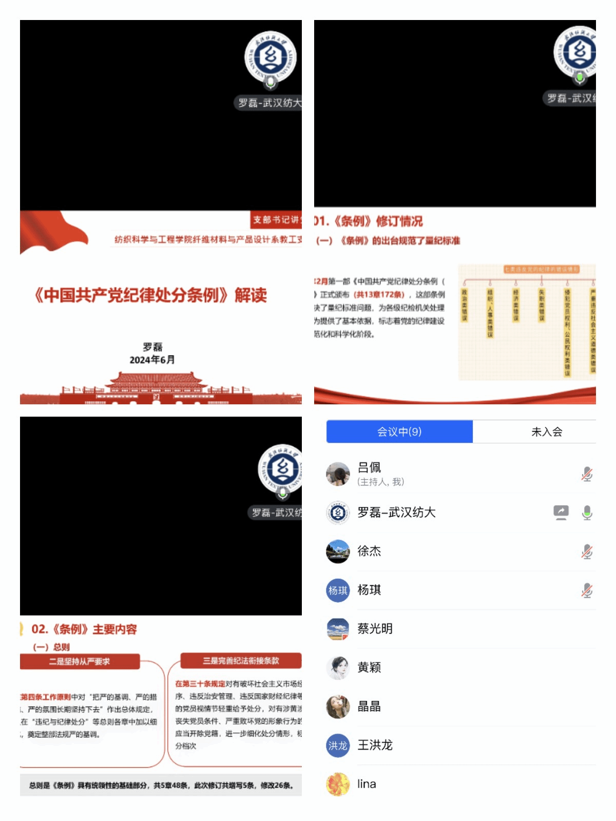 威廉希尔体育学生党支部积极响应学院党委的号召,通过一系列形式多样、内容丰富的党纪学习教育,引导学生党员深入学习党的纪律规定,提升自我修养和政治责任感。威廉希尔体育学生第一党支部、第二党支部、第三党支部集中学习了新修订的《中国共产党纪律处分条例》,强调了党员应具备的政治品格和使命担当。学生第一党支部向婷通过讲述身边优秀党员的模范事迹,激励学生党员们深入学习,严格要求自己;学生第二党支部书记王然强调了学纪、知纪、明纪、守纪的重要性;学生第三党支部书记张竣青通过身边师生党员的生动故事,激发了党员们学习先进、争当先进的热情。非织学生党支部书记吴童玲以“坚定理想信念,永葆党员本色”为核心,引导党员们自觉学法明纪,严格自我约束。通过重温党的六大纪律,党员们表示将自觉改进作风,树立新风。轻化工程专业学生党支部书记余国铖强调各位党员要从强化政治修养、自觉学法明纪、坚持立身为旗、学习模范事迹等四个方面增强纪律意识。研究生第一、第二党支部书记唐晓宁、梁祥云强调了纪律的重要性,指出纪律是管党治党的“戒尺”,也是党员、干部约束自身行为的标准和遵循。会议要求党员们学纪、知纪、明纪、守纪,将遵规守纪内化为言行准则,增强政治定力和纪律定力。