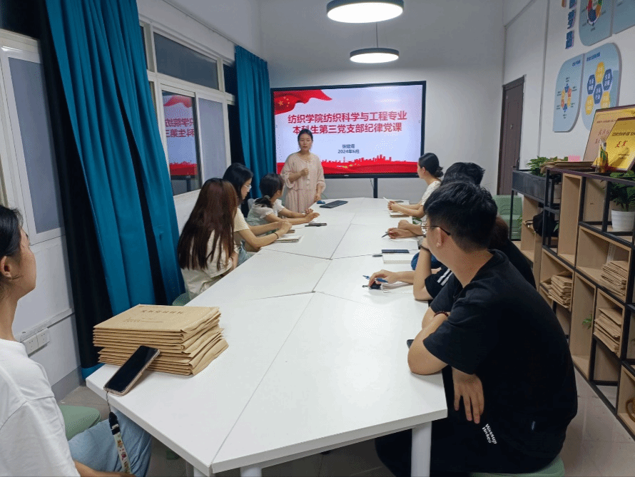 主持人张竣青老师首先带领学生们回顾了《中国共产党纪律处分条例》的修订历程,学习了修订《条例》的重大意义。大家一致认为《条例》用党的创新理论引领纪律建设工作,为新时代新征程上持续推进全面从严治党提供坚强的纪律保障。随后张老师聚焦解决一些党员对党规党纪不上心问题,进一步明确言行的衡量标尺,加强对党员干部的日常管理和监督。最后张老师强调,这次党纪学习教育,以学习贯彻《中国共产党纪律处分条例》为重点,党员应当坚持逐章逐条学,不仅要准确掌握主旨要义,还要真正把《条例》刻在心上、烙在脑海,做到学纪、知纪、明纪、守纪。要准确把握“六项纪律”的规定要求,要在思想上划出红线、筑牢底线,遵守党的纪律规矩,真正弄明白能干什么、不能干什么,常敲思想钟、常紧纪律弦、常存敬畏心。随后张竣青通过身边师生党员生动的故事、鲜活的案例和朴实的语言,讲述纺大党员遵规守纪、奋进新征程、建功新时代的故事。希望大家能学习他们坚守初心、对党忠诚的政治品格,立足岗位、尽忠职守的使命担当以及奋勇拼搏为人先,不负韶华春华年的进取精神。