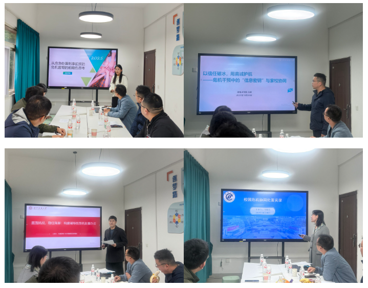 威廉希尔体育薛萍老师以《从应急处置到事前预防:危机管理的前瞻性思考》为题,通过对典型心理危机事件的系统复盘,强调校园安全管理应树立“防患于未然”的理念,通过完善制度机制、加强日常排查、实施分类施策、深化家校协同,构建“早发现、早干预、早化解”的全流程工作闭环。微电子学院方林老师以《以信任破冰,用真诚护航——危机干预中的“信息密钥”与家校协同》为题,从心理育人和沟通策略角度出发,分享了在危机干预中如何与学生建立信任关系、走进学生内心,实现“情感介入”与“问题疏导”的有机统一。机械学院徐智航老师围绕《直面挑战、稳住阵脚:构建辅导员危机处置办法》,系统梳理了危机发生后的标准化应对流程,强调在复杂情境中保持冷静判断、依法依规处理,并提出了“情景模拟+复盘推演”的能力提升路径。经济学院马晓雪老师则以《校园危机协同处置实战录》为题,结合真实案例,深入剖析了多部门联动与家校医协同在危机处置中的关键作用,指出信息畅通、角色清晰、资源整合是提升协同处置效能的核心要素。