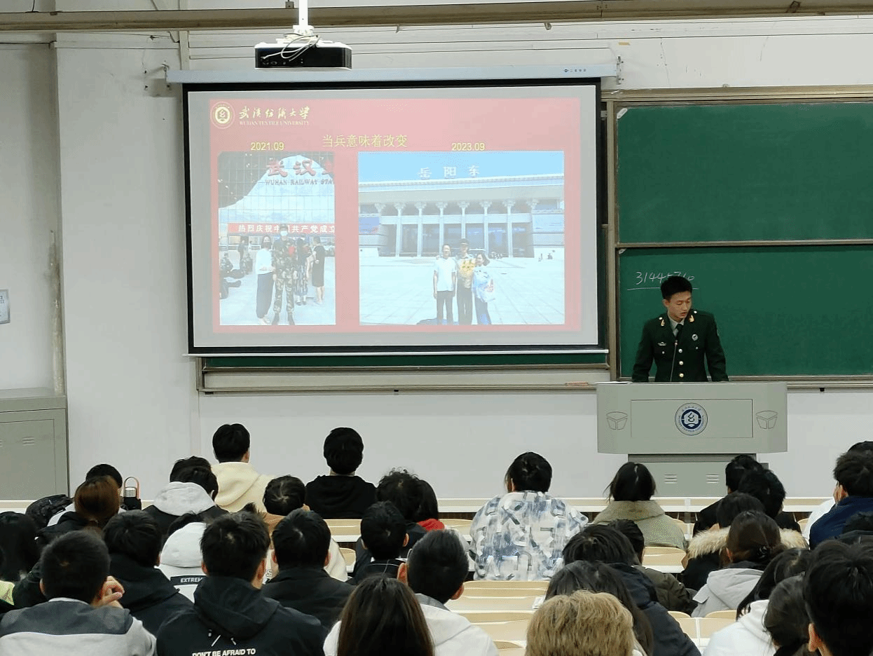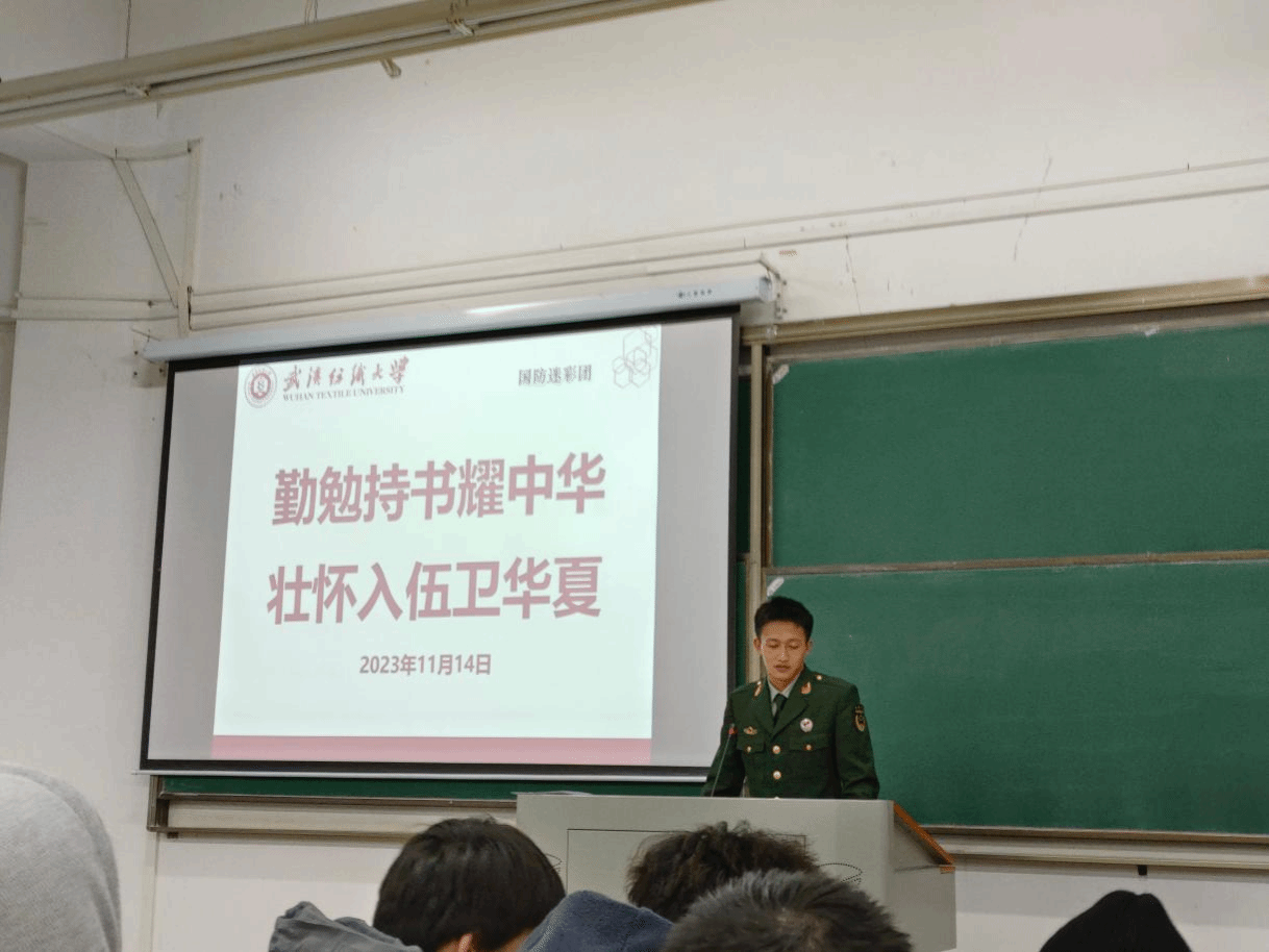 活动伊始,郭子扬先做了自我介绍。据介绍,他是纺织科学与工程12204班学生,2021年9月份参军入伍,服役于中国人民武装警察部队贵州总队贵阳支队,服役期间获得“四有”优秀士兵嘉奖,于2023年9月退伍复学,复学后助力学校征兵宣传工作。随后,他以亲身感受为引入,从部队生活,职责使命,荣誉成就三个方面讲述了当兵的意义和日常部队生活。