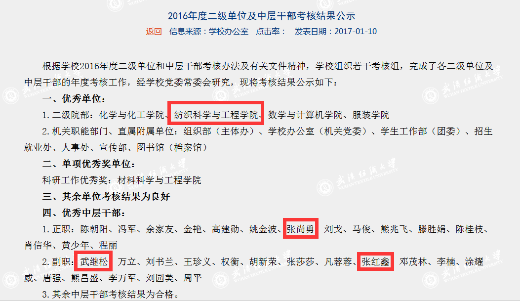 根据学校2016年度二级单位和中层干部考核办法及有关文件精神,学校组织若干考核组,完成了对各二级单位及中层干部的年度考核工作。经学校党委常委会研究,1月10日,相关考核结果在校园网主页予公布。根据考核,我院从22个二级院部中脱颖而出,获评先进单位(二级院部共4个);学院党政领导张尚勇、武继松、张红鑫分别获评优秀中层干部(全校仅32名)。